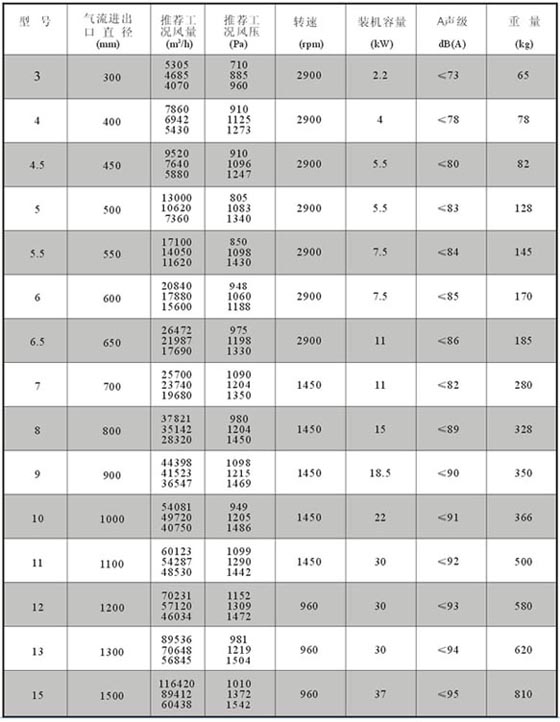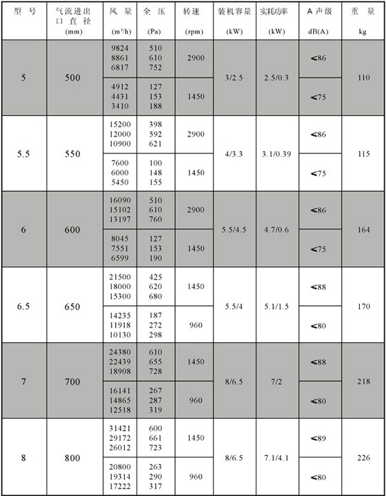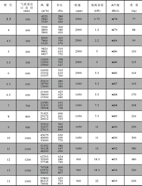 規 格: 風量:3350~96000 m3/h,風壓280~819Pa。