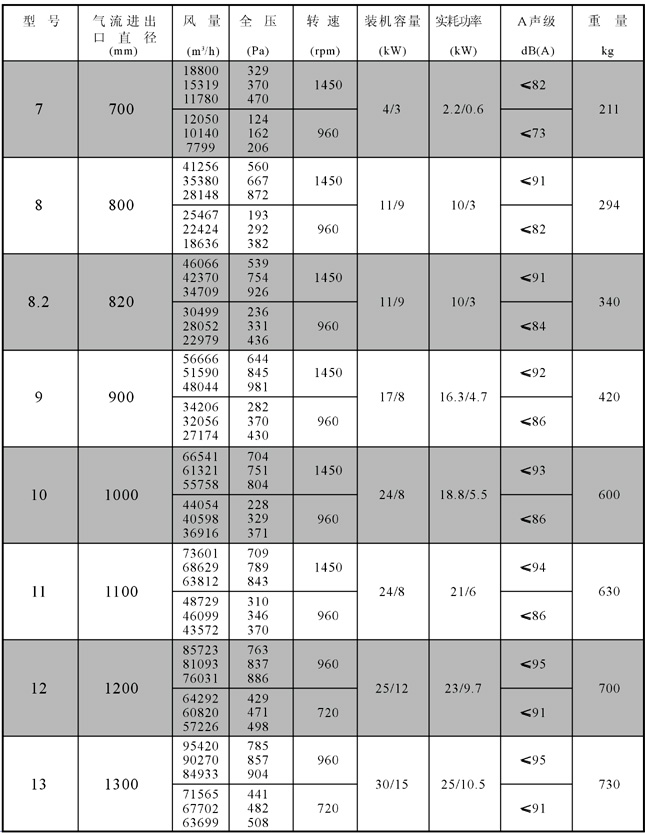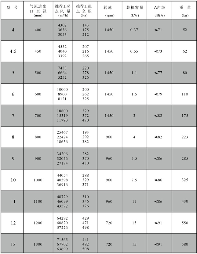 HLF(SWF)-I型低噪聲高效節(jié)能混流式通風(fēng)機性能參數(shù)表