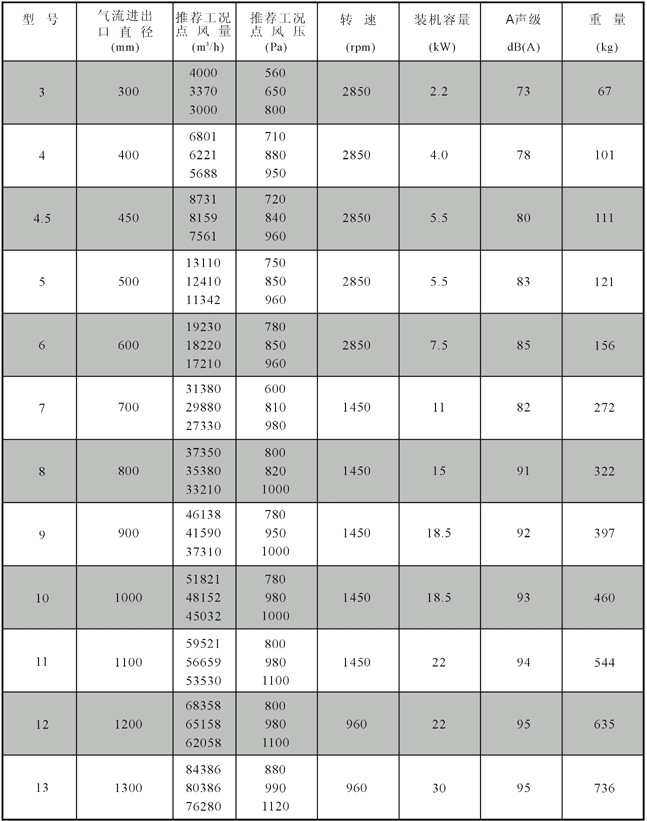 規(guī) 格: 風(fēng)量:3000~96000 m3/h,風(fēng)壓140~1200Pa。