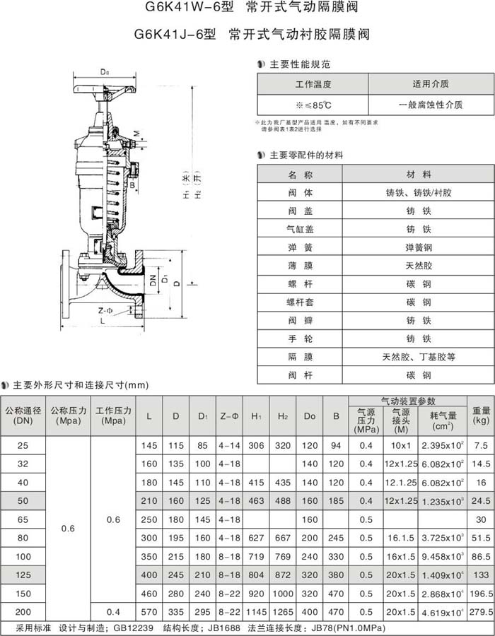 G6k41J型氣動襯膠隔膜閥重要性能參數: