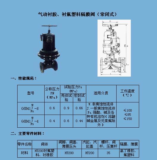 最突出特點是隔膜把下部閥體內腔與上部閥蓋內腔隔開,使位于隔膜上方的閥桿、閥瓣等零件不受介質腐化,省往了填料密封結構,且不會產生介質外漏。1、采用橡膠或塑料等軟質密封制作的隔膜,密封性較好。由于隔膜為易損件,應視介質特征而定期調換。 2、受隔膜材料限制,隔膜閥實用于低壓和溫度相對不高的場合。 3、隔膜閥按結構情勢可分為:屋式隔膜閥、直流式隔膜閥、截止式隔膜閥、直通式隔膜閥、閘板式隔膜閥和直角式隔膜閥六種;連接情勢通常為法蘭連接;按驅動方法可分為手動、電動和睦動三種,其中氣動驅動又分為常開式、常閉式和往復式三種。氣動襯膠隔膜閥 (常閉式)性能規范