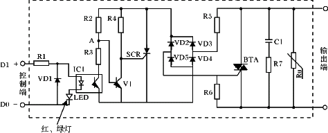 固態(tài)繼電器由三部分組成:輸進電路、隔離(耦合)和輸出電路,在輸進電路把持端參加信號后,IC1光電耦合器內光敏三極管呈導通狀態(tài),R1串接電阻對輸進信號進行限流,以保證光耦合器不致?lián)p壞。發(fā)光二極管LED唆使輸進端把持信號,二級管VD1可防止輸進信號正負極性接反時對光耦IC1造成的損壞。