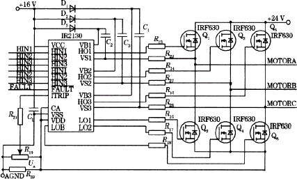 設(shè)計(jì)中,伺服電機(jī)是三相異步電動(dòng)機(jī),驅(qū)動(dòng)芯片選用電動(dòng)機(jī)把持專用芯片IR2130,如圖2所示。它帶有3個(gè)獨(dú)立的高壓側(cè)和低壓側(cè)輸出通道,可輸出6路驅(qū)動(dòng)脈沖,只需1個(gè)直流工作電源,工作頻率可達(dá)kHz。邏輯輸進(jìn)與CMOS或LSTTL輸出兼容,最小可達(dá)到15V邏輯電壓。外圍電路中的參考地運(yùn)行放大器通過外部的電流檢測(cè)電位器供給全橋電路電的模仿反饋值,假如超出設(shè)定或調(diào)劑的參考電流值,IR2130驅(qū)動(dòng)器的內(nèi)部電流保護(hù)電路就啟動(dòng)關(guān)斷輸出通道,實(shí)現(xiàn)電流保護(hù)功效。浮動(dòng)通道能夠用來驅(qū)動(dòng)N溝道功率MOSFET和IGBT,最高電壓可達(dá)到600V。功率器件選用IRF630型功率放大器,最大工作電流42A,最大工作電壓100V,具有高效性和高可靠性。