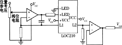 設(shè)計(jì)的地位檢測(cè)元件是一個(gè)結(jié)構(gòu)簡(jiǎn)略、精度高、可靠性高的導(dǎo)電塑料電位器,將履行機(jī)構(gòu)的直線或角位移轉(zhuǎn)換為電阻信號(hào)。如圖3所示,采用LOC210模仿線性光隔將采集來的信號(hào)