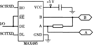 采用RS-485接口,利用MAX485作為TMS320LF2407的接口驅(qū)動(dòng)芯片,電路圖見圖6。由于RS-485為半雙工通信結(jié)構(gòu),因此用一個(gè)I/O口來把持器件處于接收或發(fā)送狀態(tài)。
