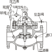 當閥門從進口端給水時,水流流過針閥進進主閥把持室,當電磁導閥打開時,把持室內的水經電磁導閥、球閥流出。球閥開度大于針閥開度,主閥把持室內壓力很低,主閥處于全開狀態。