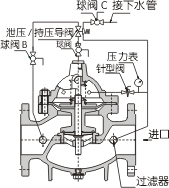 1、作泄壓閥:當泄壓/持壓導閥調劑為泄壓狀態時,水通過針閥、主閥把持室、球閥A、泄壓/持壓導閥、球閥B流向出口,此時主閥處于開啟狀態。當進口壓力超過泄壓/持壓導閥設定的安全值時,泄壓導閥會主動開啟,通過球閥C放出部分水,使管路泄壓。當壓力恢復到安全值時,泄壓閥主動封閉。作泄壓閥時,各球閥常開。