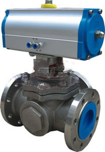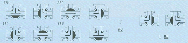 氣動三通球閥分L型和T型,介質流通方向見下圖。L型三通球閥實用于介質流向的切換,能使相互垂直的兩個通道連通:T型三通球閥實用于介質的分流、合流或流向切換,T型孔道可以使三個通道互相連通或使其中兩個通道連通,三通球閥一般采用兩個閥座結構,亦可根據用戶請求采用四閥座結構。