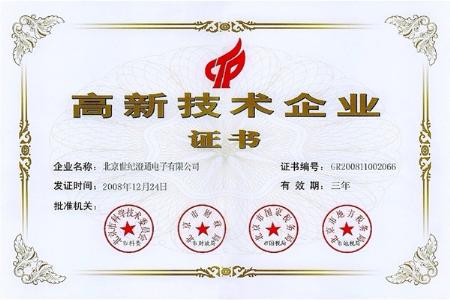 我公司于2009年2月25日收到了由北京市科委,市財政局,市地稅局和市國稅局聯合頒發的高新技術企業證書,2008年北京市高新技術企業評選資格發生了變化,入選資格更加嚴格且以往的評選結果全部歸零,在此情勢下,公司從原來的22564家高新技術企業中脫穎而出,成為新條件下入圍的2694家高新技術企業中的一員,我公司已經邁入高新技術企業行列。