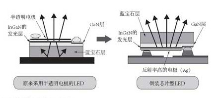 另外,采用倒裝芯片安裝方法安裝LED芯片的話,發光層的光射出外部時不會受到電極的遮蔽。尤其是采用藍寶石底板的藍色LED等只在LED芯片一面設置電極的產品,其效果更為明顯。通過倒裝芯片安裝的LED的發光效率,與采用引線鍵合的安裝相比,可進步數十%。