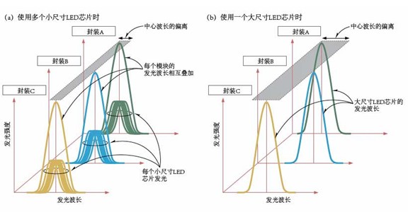 大輸出功率白色LED的實現方法包括使用1mm見方的大尺寸藍色LED芯片的方法,以及將多個約0.3mm見方的小尺寸藍色LED芯片收納于一個封裝內的方法。使用多個小尺寸LED芯片,即使封裝內的藍色LED芯片的發光特性不均,由于每個芯片的發光光譜疊加,所以不同封裝之間不輕易出現特性偏差。