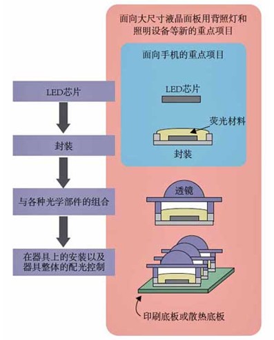 日美歐的LED廠商欲瞄準背照燈、車載設備以及照明產品等新市場擴大業務領域。在新市場上,與光學部件的組合使用、面向產品的安裝方法以及產品整體的配光控制越來越重要。LED廠商的目標是涉足這些領域,進步產品的附加值。