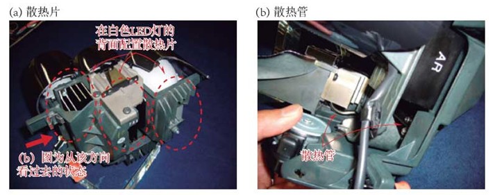 豐田汽車的“雷克薩斯 LS600h”上配備的LED前照燈為了防止白色LED燈過熱,在各燈的背面設置了散熱片(a)。為了能更有效地散熱,還設置了散熱管,預防燈殼過熱(b)。通過這些措施,即使不使用基于冷卻扇的強制空冷,也可為白色LED燈散熱。