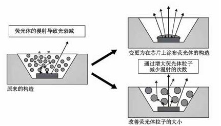 以前在封裝LED芯片時,采用的是在安裝到LED芯片表面的透明硅樹脂中混合熒光體的方法。采用該方法,根據熒光體發生變化的光波在碰到其他熒光體時會發生漫射。在反復發生漫射的過程中,會導致光衰減。