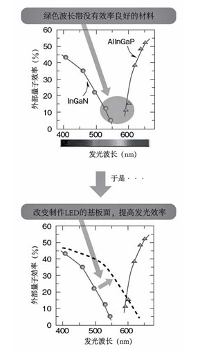 這種狀況開始出現改觀。日本國內外的大學和LED芯片廠商等已開始著手研究通過改變GaN結晶的成長面,來大幅進步效率。假如GaN類半導體的結晶面得以改變,有可能會將綠色LED的效率進步至目前的2倍以上。