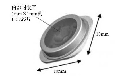 LED芯片的尺寸為1mm×1mm,為普通LED的10倍,而且收納于具有金屬封裝內。
