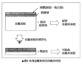金屬系高散熱基板又分成硬質(zhì)(rigid)與可撓曲(flexible)系基板兩種(圖4) ,硬質(zhì)系基板屬于傳統(tǒng)金屬基板,金屬基材的厚度通常大于1mm,硬質(zhì)系基板廣泛應(yīng)用在模塊與照明模塊,技術(shù)上它是與鋁質(zhì)基板同等級高熱傳導(dǎo)化的延伸,未來可看應(yīng)用在高功率LED的封裝。