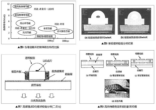 圖6是各種金屬系封裝基板的特性比較,一般而言金屬封裝基板的等價熱傳導(dǎo)率標準大約是2W/m?K,為滿足客戶4~6W/m?K高功率化的需要,業(yè)者已經(jīng)推出等價熱傳導(dǎo)率超過8W/m?K的金屬系封裝基板。