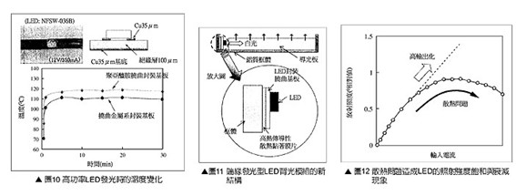 由圖8可知使用高熱傳導(dǎo)性盡緣層封裝基板,可以大幅降低LED芯片的溫度。此外基板的散熱設(shè)計,透過散熱膜片與封裝基板的組合,還可看延長LED芯片的使用壽命。