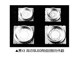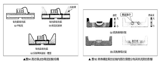 圖13是高功率LED陶瓷封裝的外觀;圖14是高功率LED陶瓷封裝的基本結(jié)構(gòu),圖14(b)的反射罩電鍍銀膜。它可以進步光照射率,圖14(c)的陶瓷反射罩則與陶瓷基板呈一體結(jié)構(gòu)。