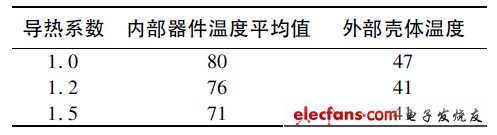 ( 3) 灌膠導熱系數對驅動電源散熱影響情況,由于電源的殼體結構已經確定,因此驅動電源的散熱主要通過膠體傳導,將熱量傳導到殼體,而后通過對流散熱。表1 是導熱系數不同的膠體的電源器件和殼體溫度情況( 輸進電壓~ 100 V,輸出48 V/3 A,環境溫度25 ℃) .