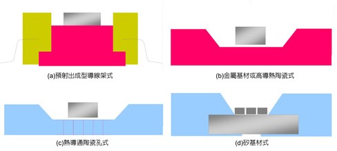 隨著LED封裝功率提升,多晶粒封裝(Multi-chip Package)成為趨勢,傳統(tǒng)高功率LED封裝多采用塑料射出之預成型導線架(Pre-mold Lead Frame)方式(圖1a),封裝載體(Carrier)又稱為芯片承載(Die Pad),為一連續(xù)的金屬塊,已無法滿足多晶粒串接之電性需求,電性串并聯(lián)方式直接影響LED晶粒電測分檔(Bin)的精密程度、可靠度壽命以及封裝體在應用時所需要的驅(qū)動電路設計。于是眾多LED封裝型式陸續(xù)被提出,圖2舉出幾個代表性高功率LED封裝典型例子。