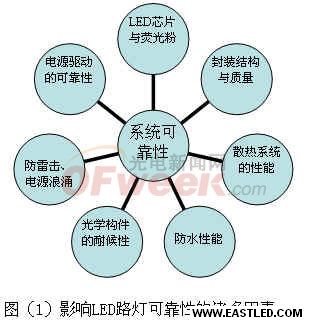 近年來,在戶外照明范疇,新型LED路燈正引起眾多產業界和投資者的關注,全國有數百家企業推出了各自的LED路燈產品,幾乎各個城市都有或多或少的LED路燈已經安裝到城市的干道上。然而在眾多的產品序列中,良莠不齊,一些產品仍欠完善,其中標題最大的是LED路燈的整體可靠性。LED道路照明系統不同于傳統照明燈具,相對要復雜得多,影響整體可靠性的因素也多。參見圖(1)。