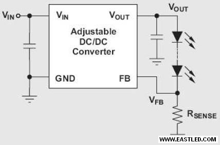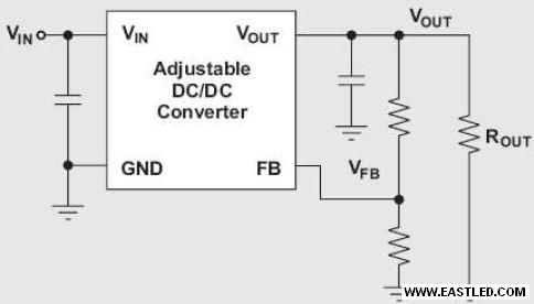 如圖1所示,為了從輸進電壓供給較高或較低的調(diào)節(jié)輸出電壓,任何可調(diào)式DC/DC 轉(zhuǎn)換器都能夠加以修正。在這類配置中,假如假設(shè) ROUT 純粹是電阻負載,則VOUT = IOUT × ROUT。當DC/DC 轉(zhuǎn)換器用來給LED供電時,它會借著調(diào)節(jié)下端FB電阻把持通過LED的電流,如圖2 所示。由于負載本身(LED)代替上端FB電阻的緣故,傳統(tǒng)的小信號把持回路公式不再實用。DC 負載阻抗為