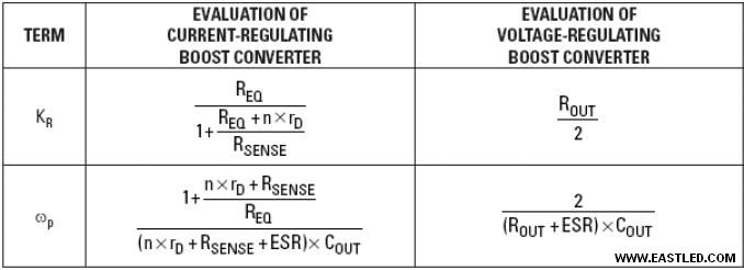 盤算兩種電路的負載周期D以及VOUT與REQ的修正值所應用的方法都雷同。Sn 及Se分辨是升壓轉(zhuǎn)換器的自然形成電感斜率與補償斜率,而fSW是切換頻率。關(guān)于電壓調(diào)節(jié)升壓轉(zhuǎn)換器的小信號模型與電流調(diào)節(jié)升壓轉(zhuǎn)換器的模型,兩者之間真正的差別來自乘以跨導用項(1–D)/Ri 的抗阻KR以及重要電極wp。這些差別已在表1予以概述。具體信息請見參照 1。由于在調(diào)節(jié)電壓的轉(zhuǎn)換器中,RSENSE 值一般遠低于 ROUT 值,因此,電流調(diào)節(jié)轉(zhuǎn)換器的增益 (其中 ROUT = REQ) 幾乎都低于電壓調(diào)節(jié)轉(zhuǎn)換器的增益。