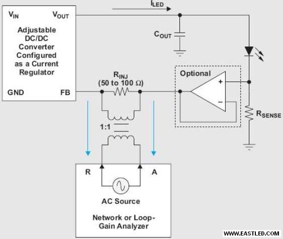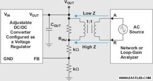 若要丈量把持回路增益與電壓調(diào)節(jié)轉(zhuǎn)換器的相位,網(wǎng)絡或?qū)S没芈吩鲆?相位分析儀一般會應用1:1變壓器將小信號通過小阻抗(RINJ)注進回路中。然后,分析儀便會根據(jù)頻率丈量并比擬A點的注進信號與R點的回傳信號,之后,報告幅度差別(增益)與時間延遲(相位) 的比例。只要A點的阻抗遠低于 R 點的阻抗,即可在回路中的任一處插進此阻抗,否則注進的信號會過大,因而干擾轉(zhuǎn)換器的運作點。如圖 5 所示,高阻抗節(jié)點是一般插進此阻抗的地位,也是FB電阻在輸出電容(低阻抗節(jié)點) 偵測輸出電壓的處所。