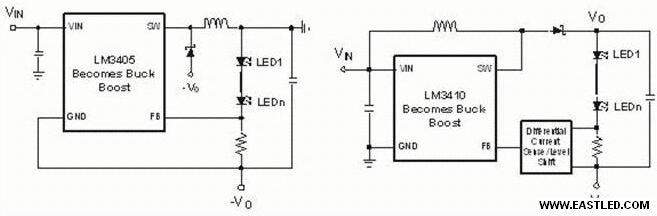 單電感Buck-boost可以像Buck或Boost調節器一樣組建,使它在系統本錢的角度來講很吸引人。這種拓撲的一個毛病是Vo被反置(圖2a)或者以VIN為參照(圖2b)。測平移動或者反偏電路必需要用一些轉換器。像boost轉換器,它們有一個不持續輸出電流,并且需要一個輸出電容來保持一個持續LED電流。功率MOSFET要蒙受一個峰值為IIN加上IF的電流還有一個峰值為VIN加上VO的電壓。