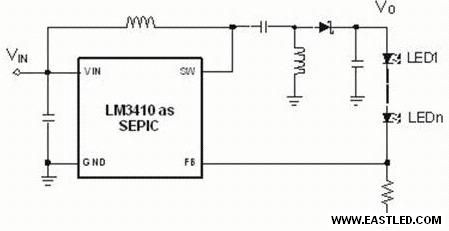 SEPIC轉換器擁有持續輸進電流的長處,這個持續輸進電流是由輸進電感和正輸出電壓產生的。像boost和單電感buck-boost,它們需要一個輸出電容來保持一個平滑LED電流。另外一個SEPIC轉換器的長處是幾乎任何一個低端調節器或者把持器都可以被設置成為一個毋需反偏或測平移動電路的SEPIC。