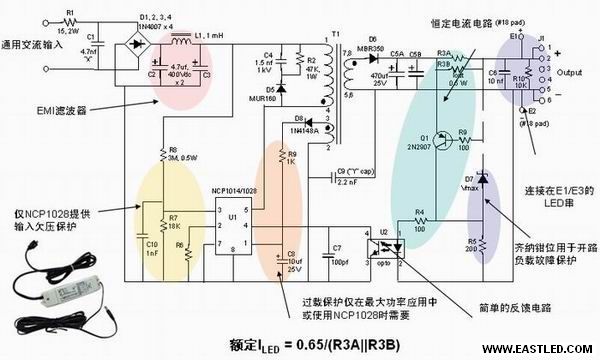 圖4:安森美半導(dǎo)體NCP3065在LED恒流降壓把持利用中的示意圖。