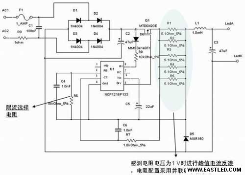 圖3:采用峰值電流把持的NCP1216非隔離型離線式LED驅(qū)動(dòng)利用。