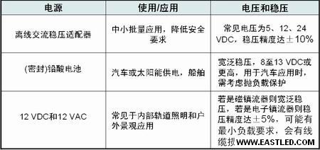 有一系列高亮度LED利用工作在8至40 VDC范疇的電源,這些電源包含鉛酸電池、12-36 VDC適配器、太陽(yáng)能電池以及低壓的12 和24 VAC交換系統(tǒng)。這類的照明利用眾多,如運(yùn)動(dòng)式照明、景觀和道路照明、汽車和交通照明、太陽(yáng)能供電照明,以及擺設(shè)柜照明等。