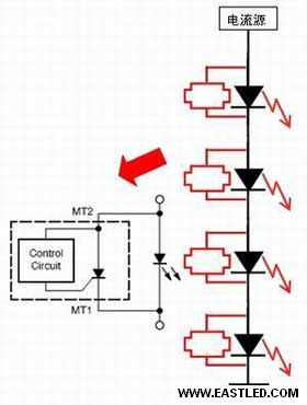 在這方面,可以采用安森美半導(dǎo)體的NUD4700 LED分流保護(hù)解決計(jì)劃。圖5是這種分流保護(hù)解決計(jì)劃的利用及原理示意圖。
