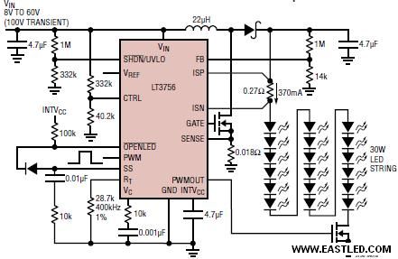 圖1:采用單個(gè)LED驅(qū)動(dòng)器LT3756驅(qū)動(dòng)50W LED串的電路。