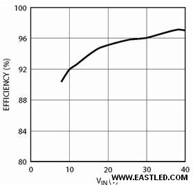 圖2:LT3750 50W LED升壓電路的效率和輸進(jìn)電壓