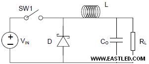 Buck 變換器只能用于履行降壓把持,就是當(dāng)電源電壓是高于所需要的設(shè)備電壓時。如圖2 所示,當(dāng)電源開關(guān)SW1 閉合時,輸進電壓VIN 連接到電感L 的輸進端。逆向偏壓二極管能確保設(shè)備電流在一個方向上傳輸。與此同時,電感中保留的能源不斷增加。當(dāng)電源開關(guān)斷開時,電感中保留的電能開釋出來,電流流經(jīng)二極管持續(xù)供給應(yīng)設(shè)備。電感中存儲的電能逐漸減少,設(shè)備電流亦開端降落。Buck 變換器的重要電能存儲設(shè)備是電感。電感的設(shè)計必需確保有足夠的電能存儲空間,滿足電源封閉期間(SW1 打開)的設(shè)備電源請求。對于HB-LED 利用,HB-LED 需在恒定電流下工作,buck 變換器亦被認為只在持續(xù)導(dǎo)通狀態(tài)(continuous conduction mode ) 下運行。