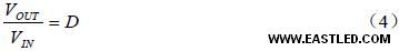 其中D 是閉合時間的占空比。在幻想情況下,逆向二極管的壓降VD 為零,打開和封閉狀態(tài)之間的電感電流之和是恒定的。如公式(4)所示,我們可以很輕易地推斷出來,buck 變換器的輸出電壓增益即是占空比D 而且永遠小于1。