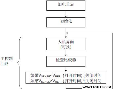 圖5 顯示了一般的軟件把持流程。重啟后,MCU 開端初始化程序。PWM打開時間初始化為它的最小值。主把持回路保留兩個變量:打開時間和封閉時間變量。這兩個變量按相反方向調(diào)節(jié),以便將整體時間是非保持在恒定程度。打開時間和封閉時間一同斷定可調(diào)節(jié)的占空比,該值和軟件開銷共同定義PWM周期的是非。
