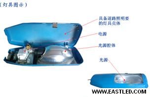 傳統照明路燈整體包含;光源,光源腔體,電源,具備道路照明請求的燈具殼體。