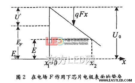 圖2為在電場(chǎng)f’作用‘F芯片電極表面的勢(shì)壘圖,其中EF為費(fèi)米能級(jí),U,為電子發(fā)射勢(shì)壘。由圖
