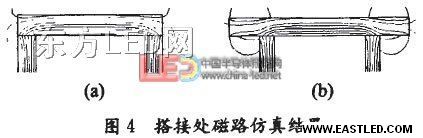 圖4中(a)、(b)仿真成果對(duì)應(yīng)于圖3中(a)、(b)兩種線(xiàn)圈磁芯搭接方法。比擬兩種線(xiàn)圈磁芯搭接處磁路仿真成果可以看出:①圖3(a)示磁芯搭接處磁路在空氣介質(zhì)中的回路最短,所受磁阻最小,因此磁損耗也最小。②由于待測(cè)LED支架回路電流為微安量級(jí),激起的磁場(chǎng)較小,易受空間電磁場(chǎng)的干擾,圖3(b)示磁芯搭接處磁路***露在空氣介質(zhì)中較多,受干擾的幾率較大。由上述分析,圖3(a)磁芯搭接方法較優(yōu),可以加強(qiáng)信號(hào)檢測(cè)端克制干擾才能,增加檢測(cè)信號(hào)幅值,必定程度上提高光鼓勵(lì)檢測(cè)信號(hào)信噪比,進(jìn)而提高缺點(diǎn)檢測(cè)精度。