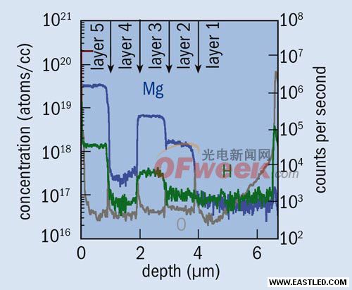 圖一:刻意將鎂原子摻雜在多層結構中的第二、第三及第五層的二次離子質譜儀量測成果(SIMS)可看出不持續的摻雜結構,而且少許的鎂原子被不經意的摻雜到了第四層,樣品表面的成果如圖所示。
