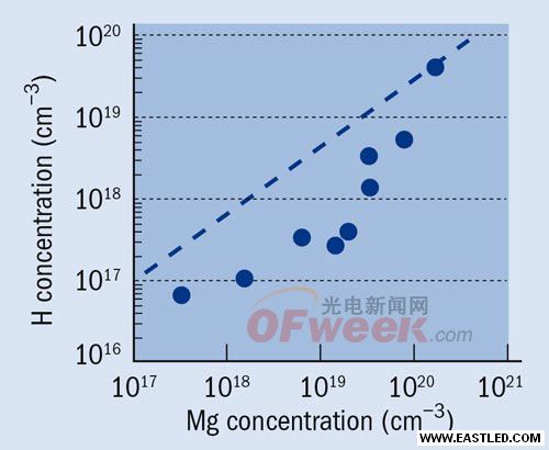 圖二:根據二次離子質譜儀(SIMS)成果,鎂的摻雜濃度高過氫的背景濃度,其中虛線代表等量的鎂及氫原子濃度。
