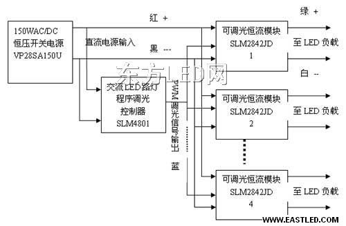 LED路燈,所以本來的交換供電電路還在,急需一批采用市電供電的LED路燈。一般市電供電的LED路燈固然也采用恒流電源,但大多沒有調(diào)光功效,然而即使采用市電供電,如何進一步節(jié)能也還是一個重要的標題。為此上海龍茂公司和香港煒達公司緊密合作,推出了一系列市電程序調(diào)光LED路燈的電源解決計劃。其中有80W(100W),112W(150W),168W(200W),的各種解決計劃(括號中的數(shù)字代表了所采用的恒壓源的瓦數(shù))。所有這些計劃都采用了先恒壓再恒流的計劃,以各自實現(xiàn)最高的性能。