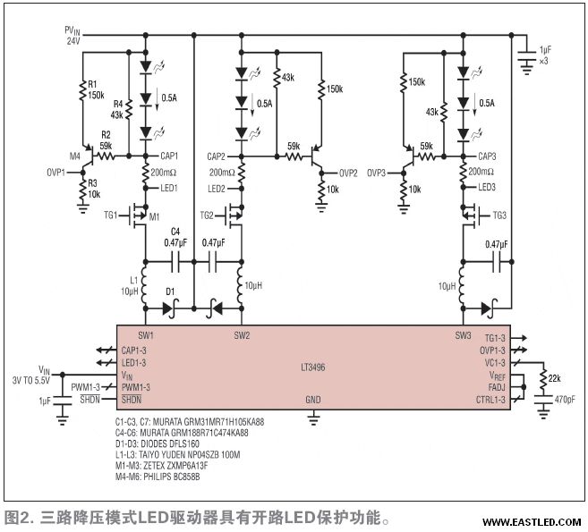 圖2:三路降壓模式LED驅動用具有開路LED保護功效。