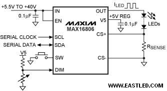 圖1:350mA線性HB LED驅動器IC MAX16806能夠省往微把持器或開關模式轉換器