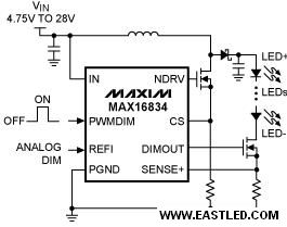 圖4所示HB LED驅動器電路用于汽車中LCD背光,MAX16834集成了高邊檢放逐大器、PWM調光MOSFET驅動器和高度可靠的保護電路,大大簡化了LCD背光電路的設計。該款HB LED驅動器能夠供給3000:1 PWM調光范疇,輸進電壓范疇為4.75V至28V,在冷啟動和拋負載狀態下確保穩固工作。